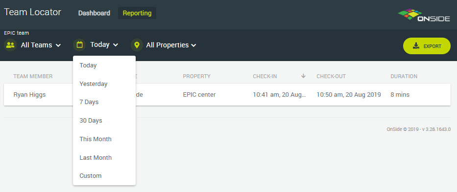 By default, when you open this screen it will show all of the current day's information, from all teams and properties. To change any of these filters, simply click them and make your selection.