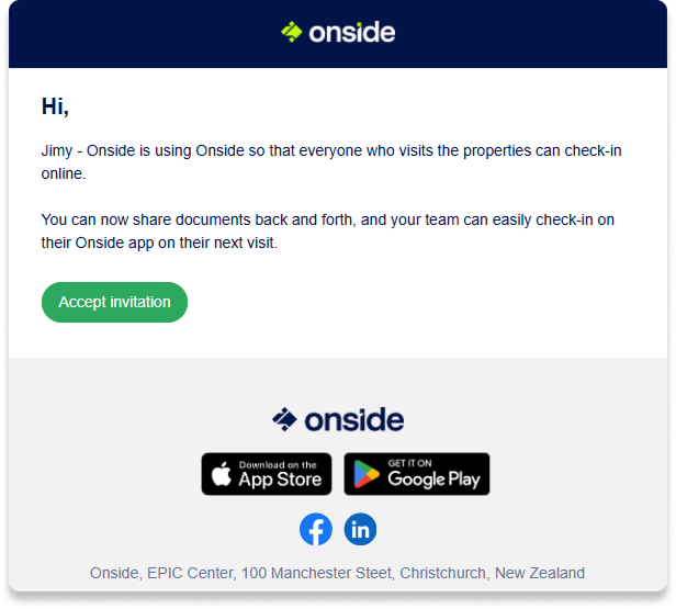 - You can then copy an invite link which you could use in your own emails to your contractors, or you can click 'Send Invite' to send invites to their company admins. If they don't have an Onside account yet, they'll receive an email like this. If they're already using Onside, they'll get an email like this.